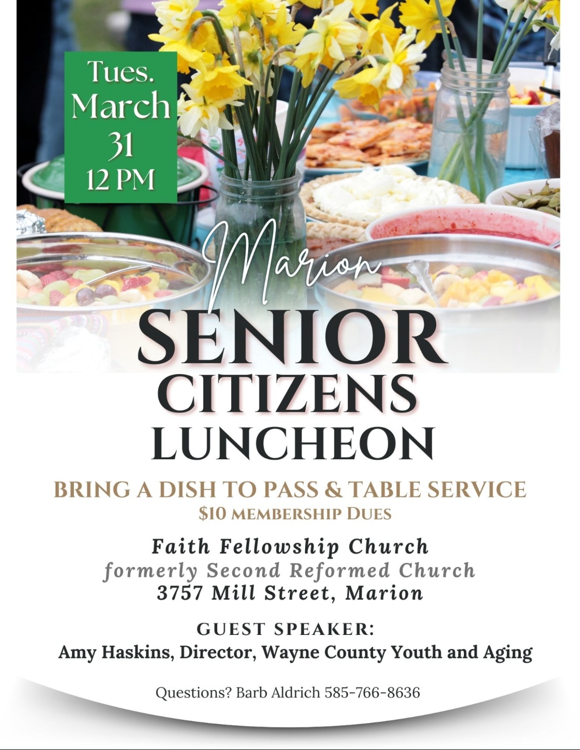 May Senior Citizen Luncheon will be held Tuesday, March 31st at Noon in the Faith Fellowship Church. For more information contact Barb Aldrich at 585-766-8636